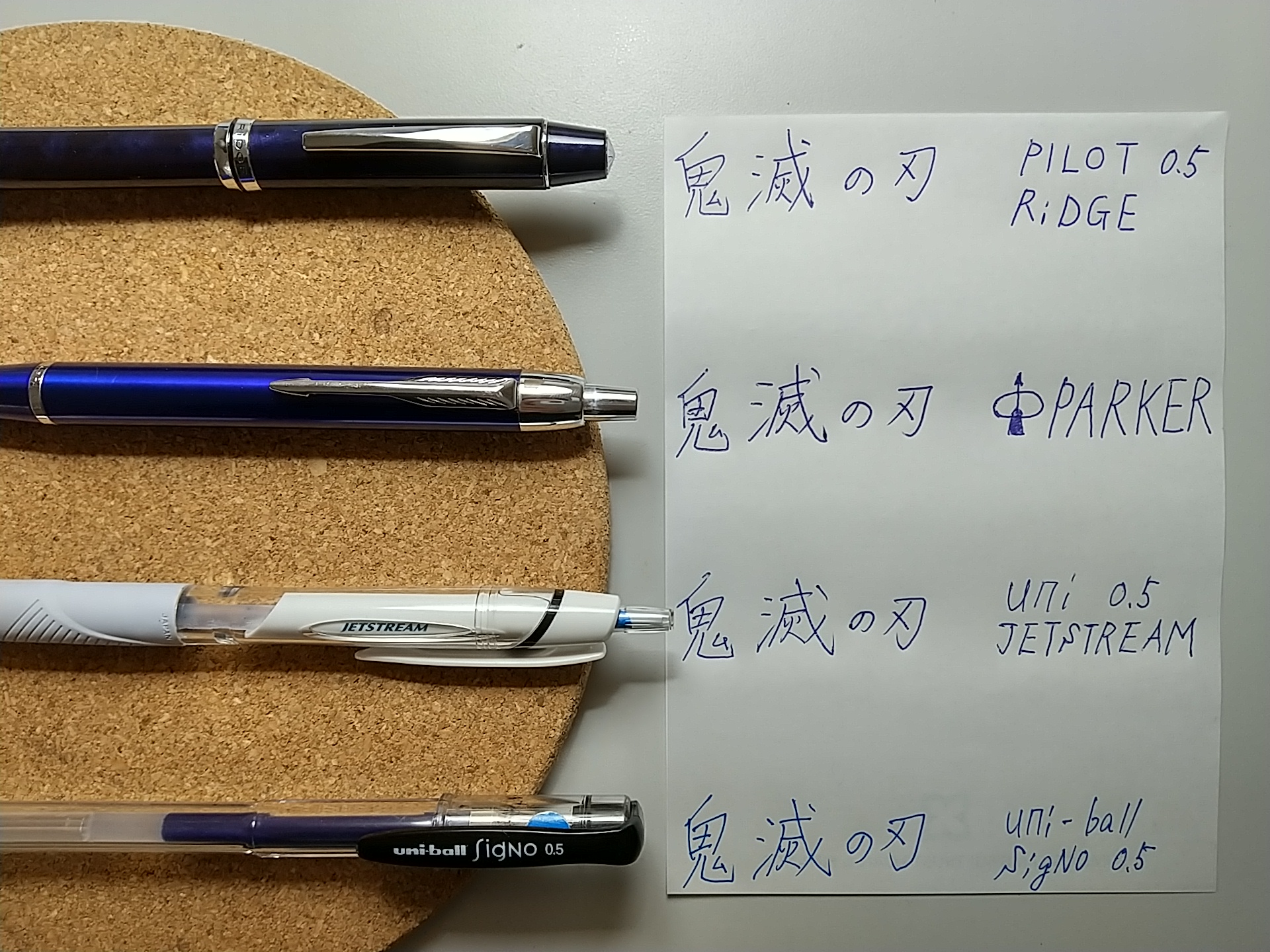 引き出しを整理するとブルーボールペンが出てきたので書き比べしました。写真上から ※PILOTリッジ・鮮明で綺麗な青 ※パーカー・落ち着いたブルーブラック ※三菱ジェットストリーム・青紫に近い紺色 ※三菱ユニボールSigNo(水性)・薄い青。1本1本に特徴があり黒にない青独自の濃淡が楽しめます。PILOTとパーカーはインクの「かすれ」が少なく大事な書類にサインする際に適してます。 お勧めは三菱ジェットストリーム。安価なのにインクのりが良く滑らかで本当に良く出来たペンです。SigNoも万年筆に近いタッチで書けるので気に入ってます。